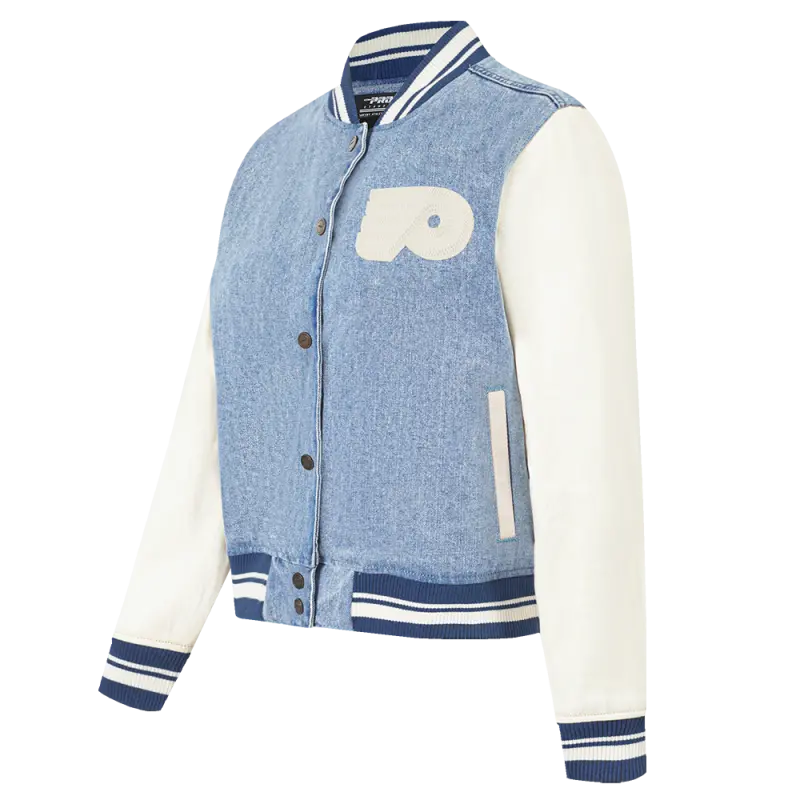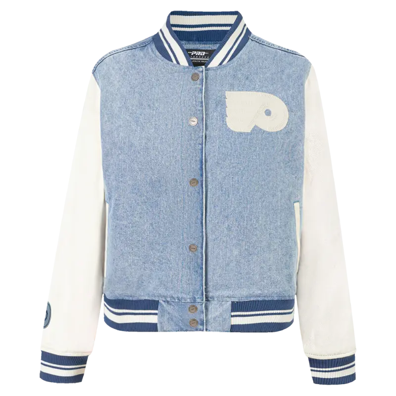 NHL PHILADELPHIA FLYERS VARSITY BLUES WOMEN’S DENIM VARSITY JACKET (DENIM\/LINEN)