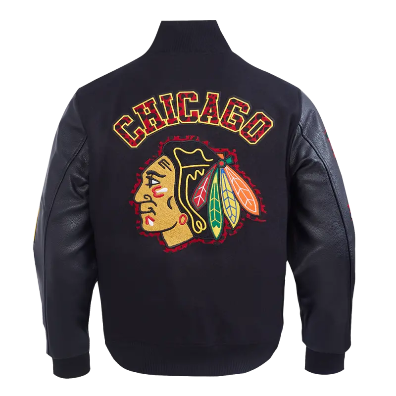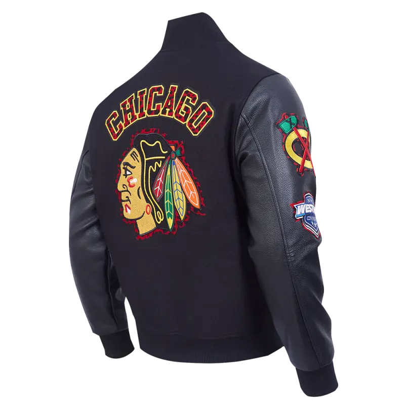 NHL CHICAGO BLACKHAWKS ANIMAL PRINT MEN’S WOOL VARSITY JACKET (JET BLACK)